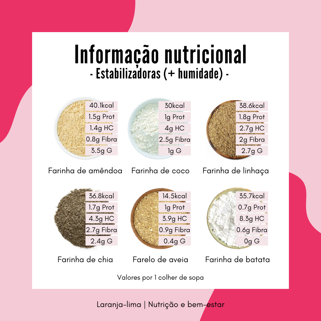 Depois as farinhas estabilizadoras, que também conferem humidade à massa. Normalmente não são usadas em grande quantidade. As que eu uso mais são a farinha de amêndoa, de coco e de linhaça, sobretudo em bolos, panquecas, bolachas, e para ligar a massa dos hambúrgueres de leguminosas.