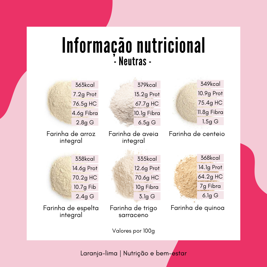Primeiro temos as farinhas neutras, comummente usadas para fazer pão, bolos, bolachas, base de tartes, pizza e até hambúrgueres vegetais.